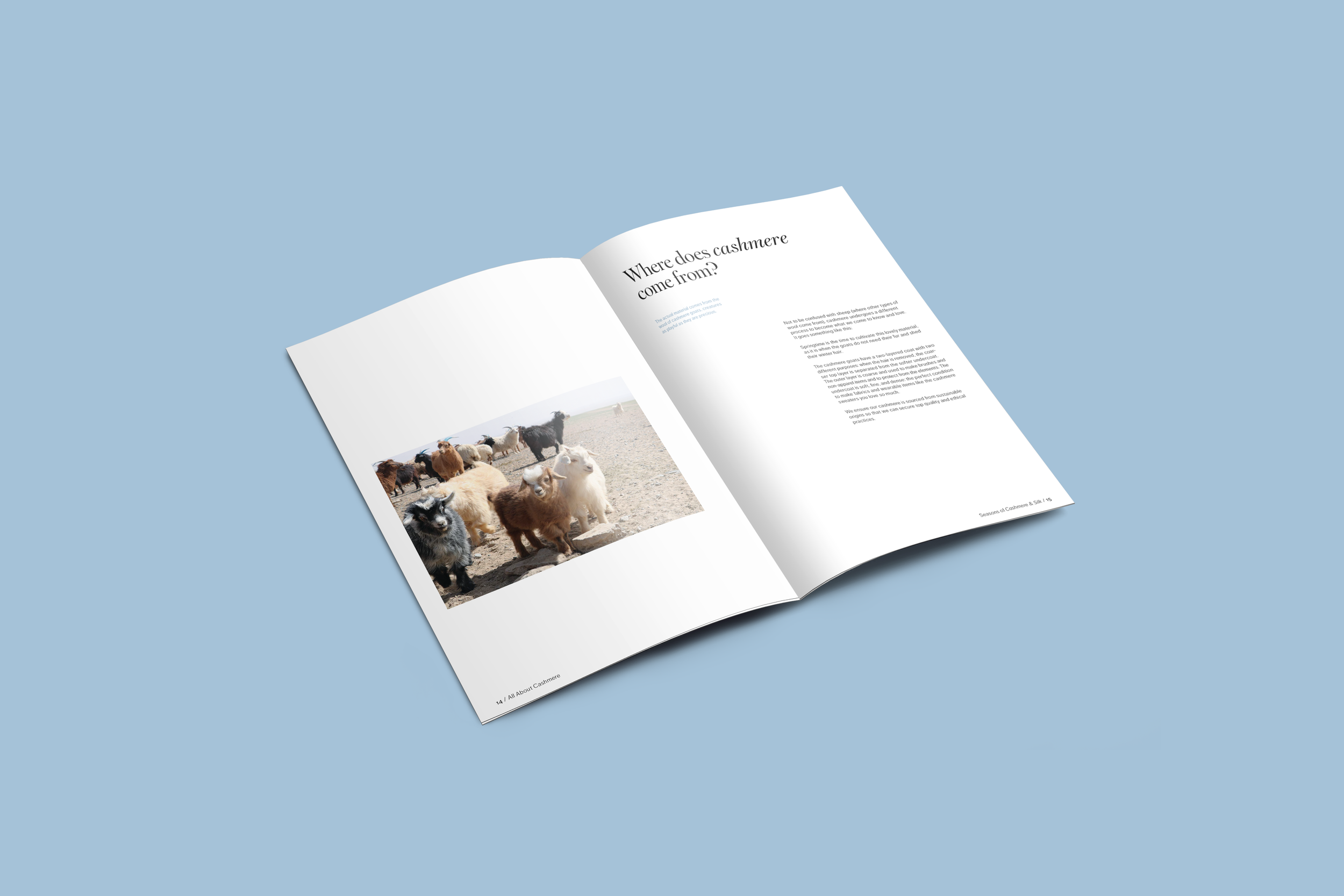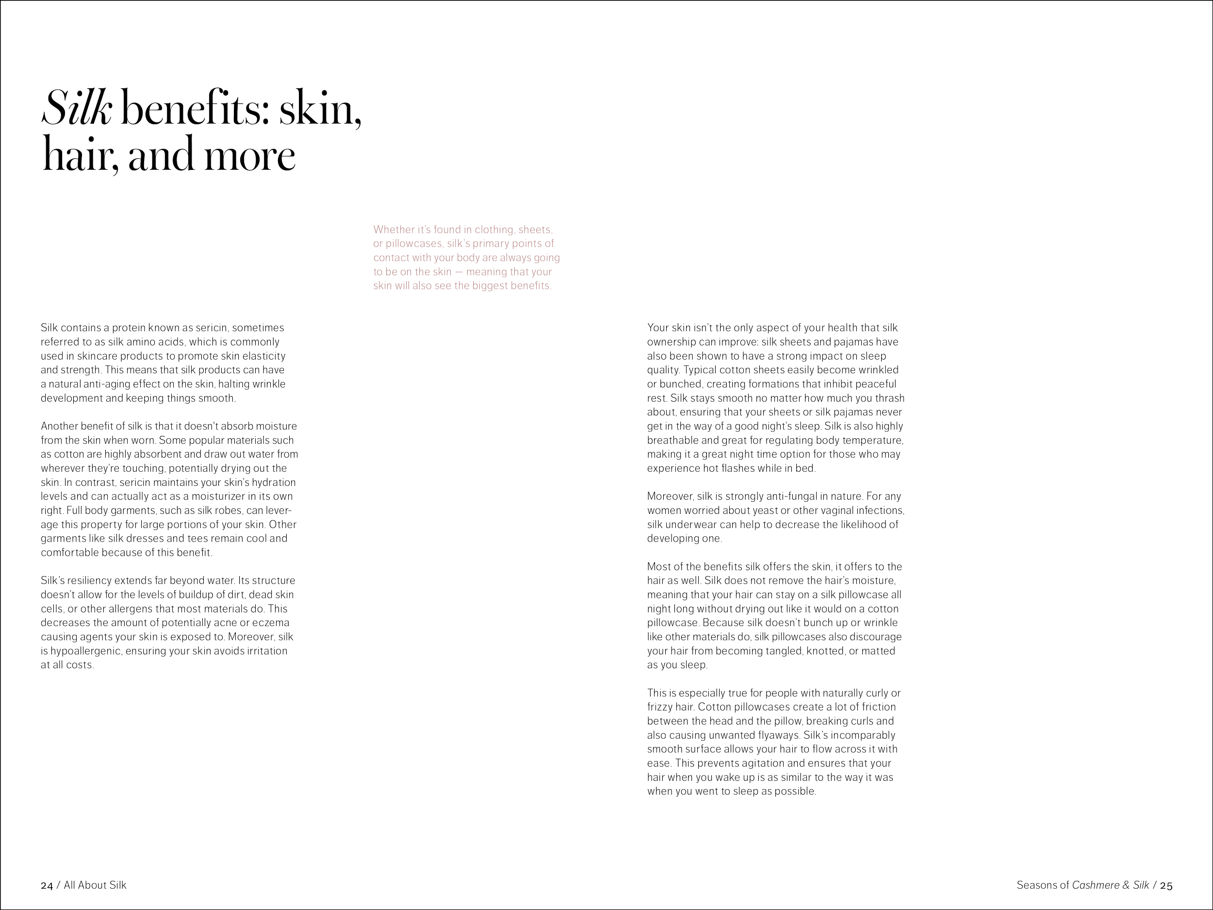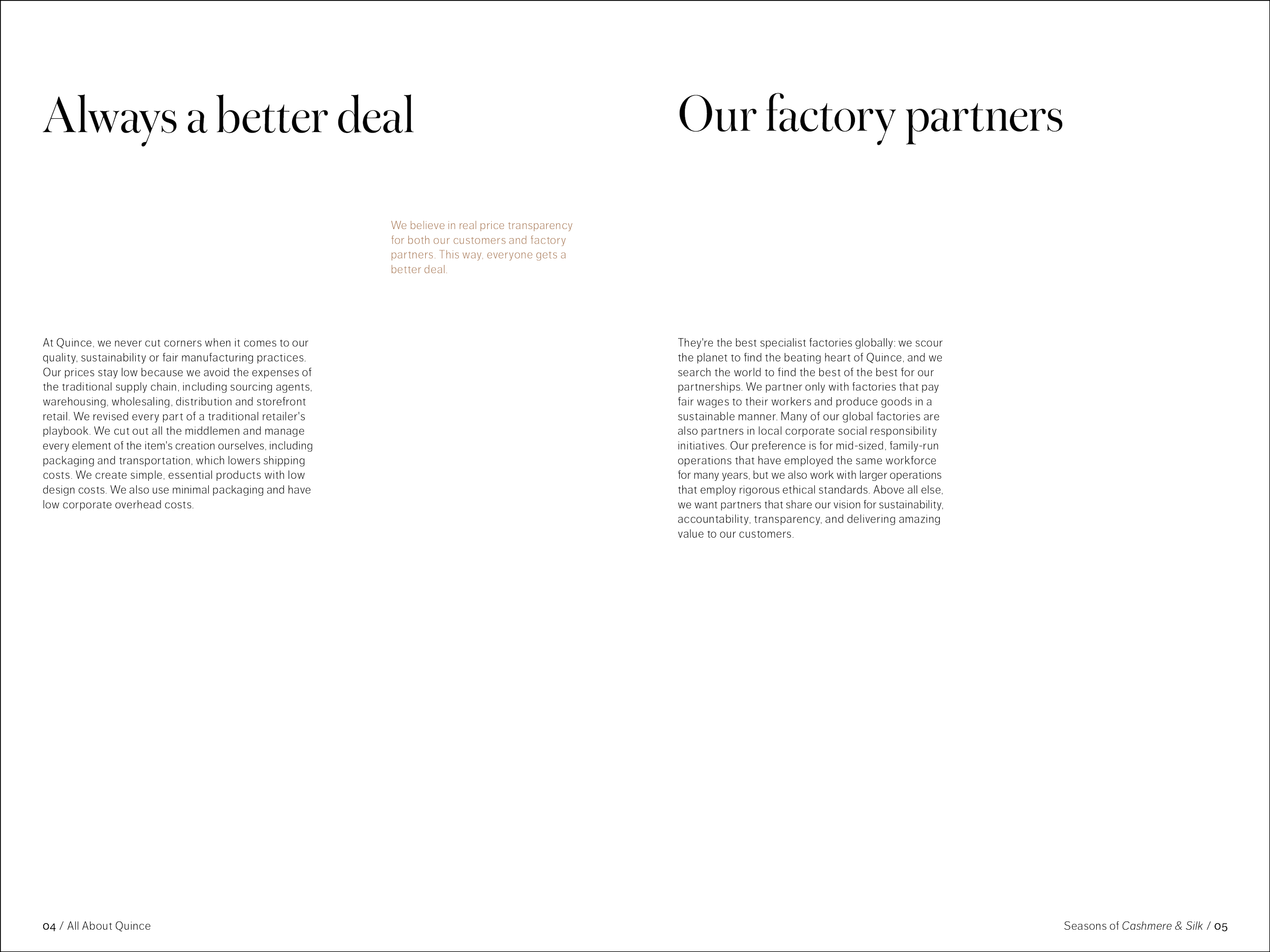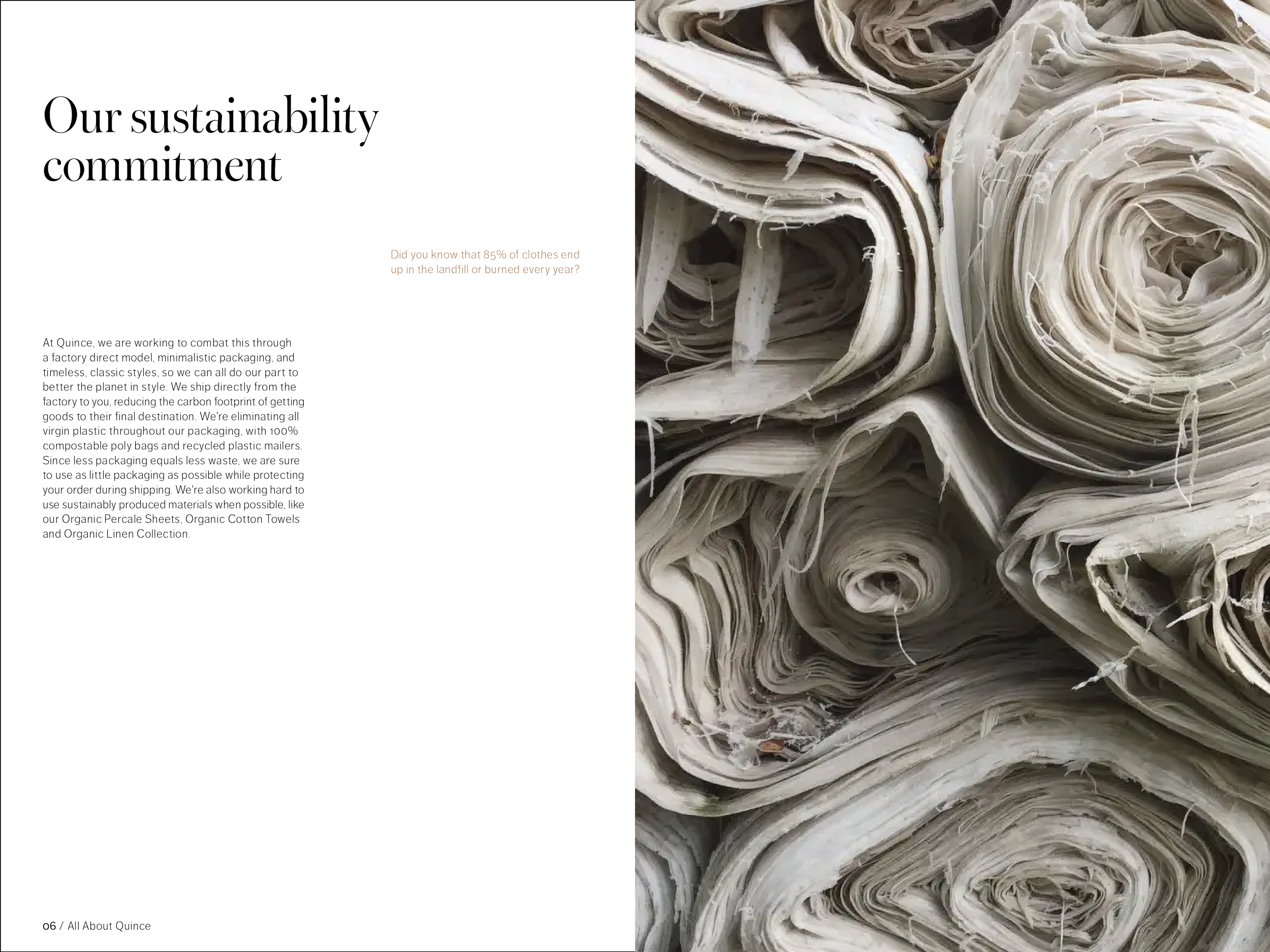 48 pages, saddle-stitch bound. One part of a fictional series promoting the brand Quince while educating the consumer on natural fabrics. Created in Adobe InDesign.